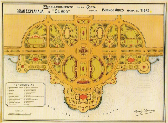 Dado que en Olivos se hallaba uno de los sitios más pintorescos de la costa, las construcciones tomaban una magnitud mayor y un “carácter más aristocrático”. Una gran explanada -con diferentes aterrazamientos- seguía el modelo de Niza y de Montecarlo. En lo alto, un edificio para el casino dominaría el conjunto para ofrecer las mejores vistas panorámicas. La terraza era de 860 por 1140 metros y constituía la más importante de las proyectadas. Asimismo, penetraba sobre el río para alojar al edificio del casino, de aspecto monumental y riqueza arquitectónica. Un rond-point central de 200 metros de diámetro se ubicaba frente a la terraza. Completaban el conjunto museos, acuarios, casas de té, salones de concierto, restaurante, embarcaderos y un faro. El sitio, por sus propiedades geográficas, generaba amplias visuales hacia los grandes montes del Delta.